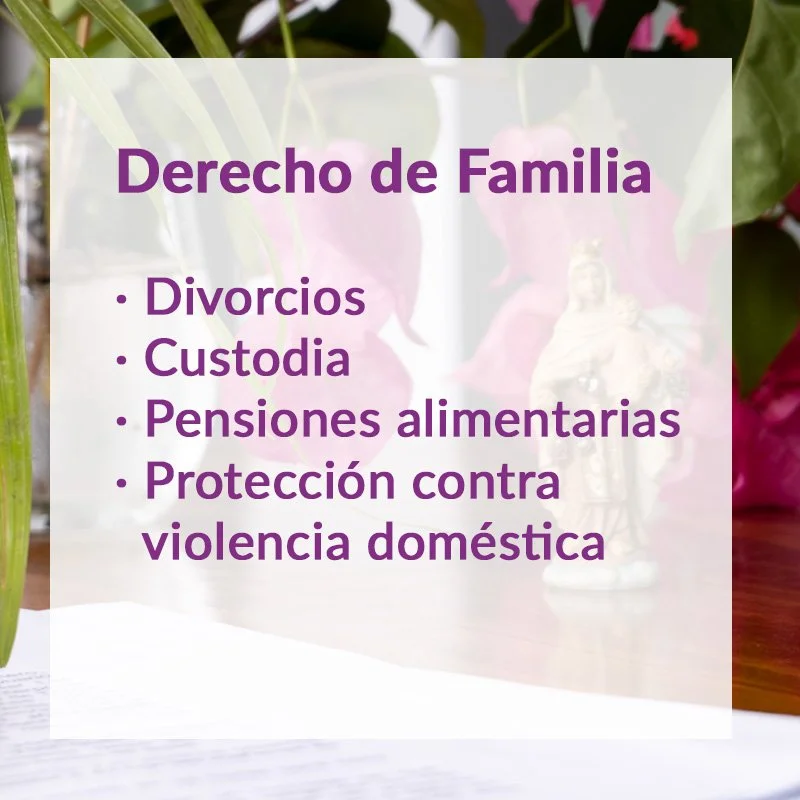 Derecho de Familia, Pensiones, Violencia Doméstica, Derecho Civil, Comercial, Agrario, Contencioso Administrativo y Servicios Notariales.